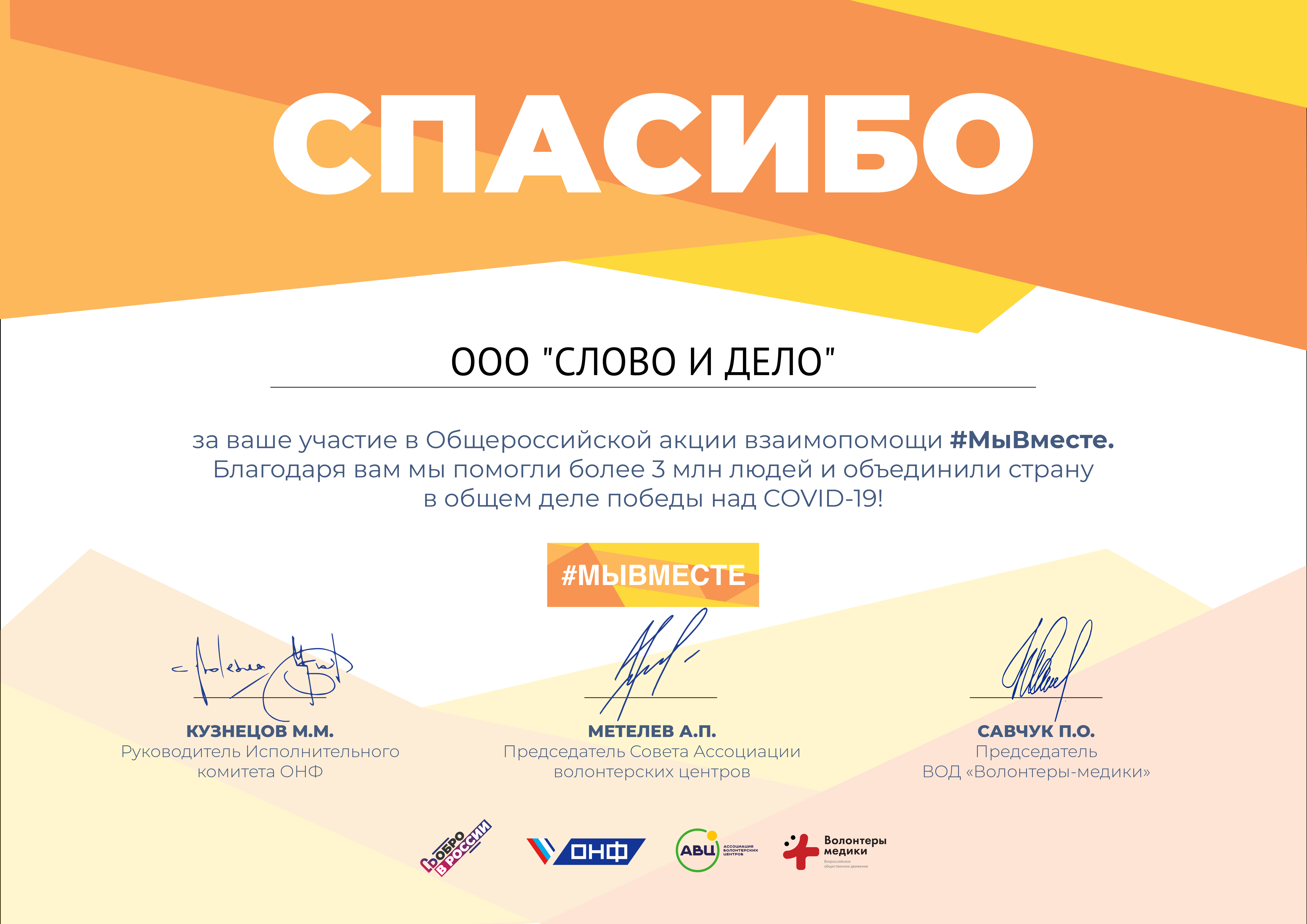 ООО "Правовой Центр "СЛОВО И ДЕЛО" приняло участие в Общероссийской акции взаимопомощи #МыВместе в общем деле победы над COVID-19